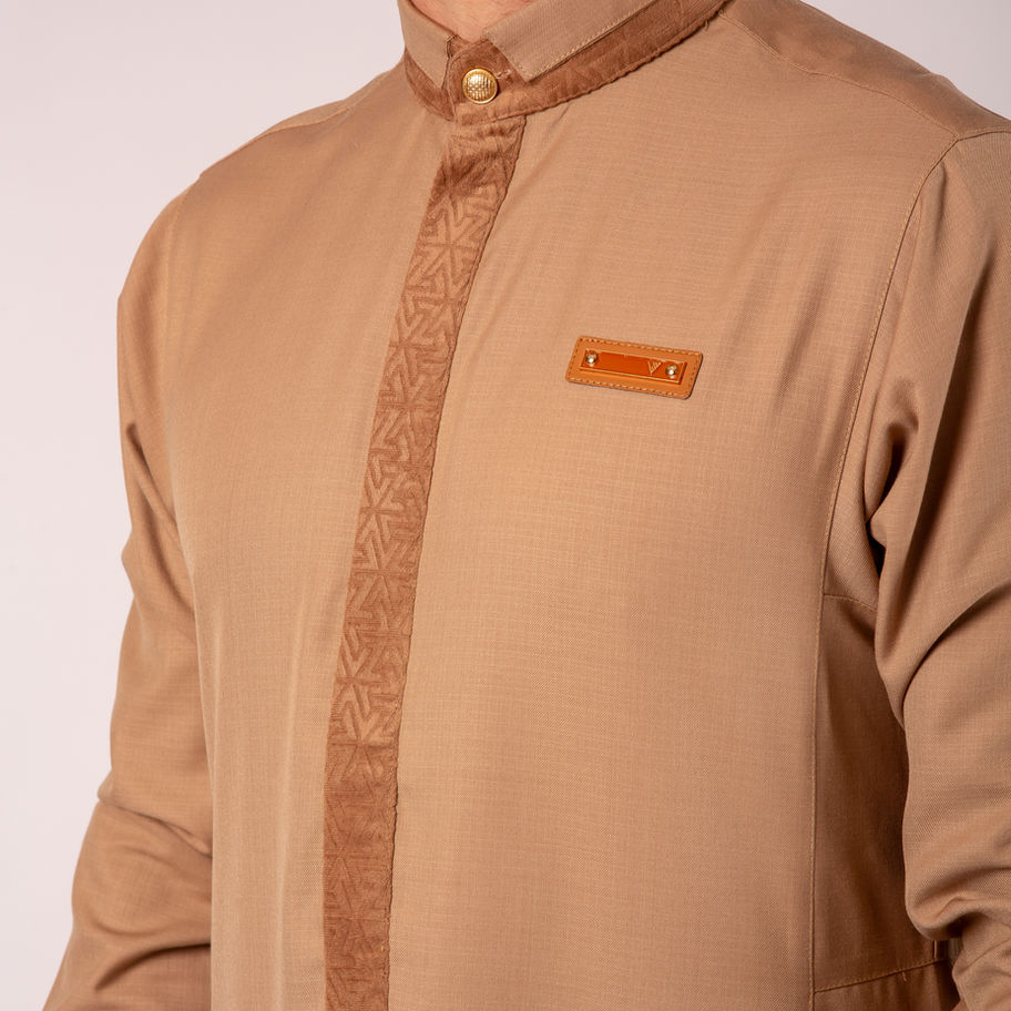 ntroducing the AAR25318 — a refined and stylish Arabian garment in a warm caramel hue that exudes sophistication and charm. This thobe's rich, smooth color adds a touch of luxury, offering a modern yet timeless look perfect for any occasion.